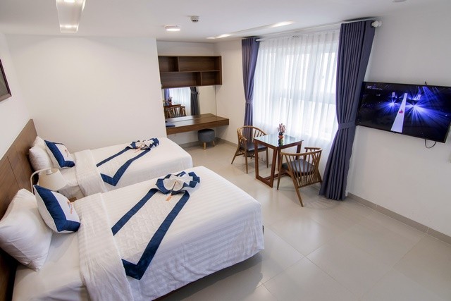 Phòng nghỉ được bài trí ấm cúng với nội thất hiện đại, đảm bảo giấc ngủ ngon và không gian riêng tư trọn vẹn cho du khách.